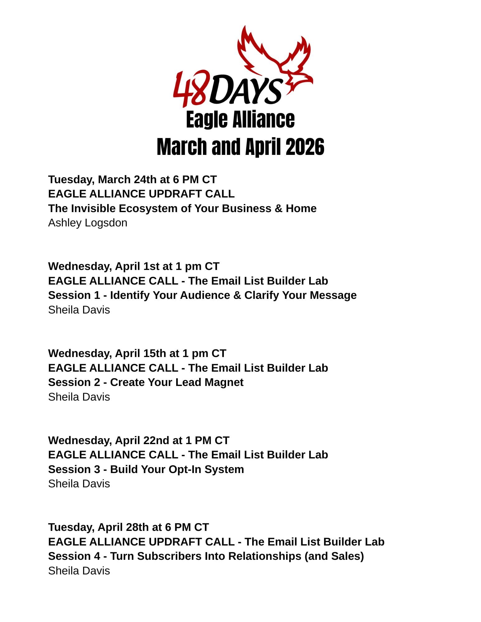 The Eagle Alliance isn’t just a membership—it’s a rhythm of growth. We have designed a fall calendar of live workshops, Q&A calls, and special evening Updraft sessions to give you the clarity, accountability, and encouragement you need to move forward in business and in life.