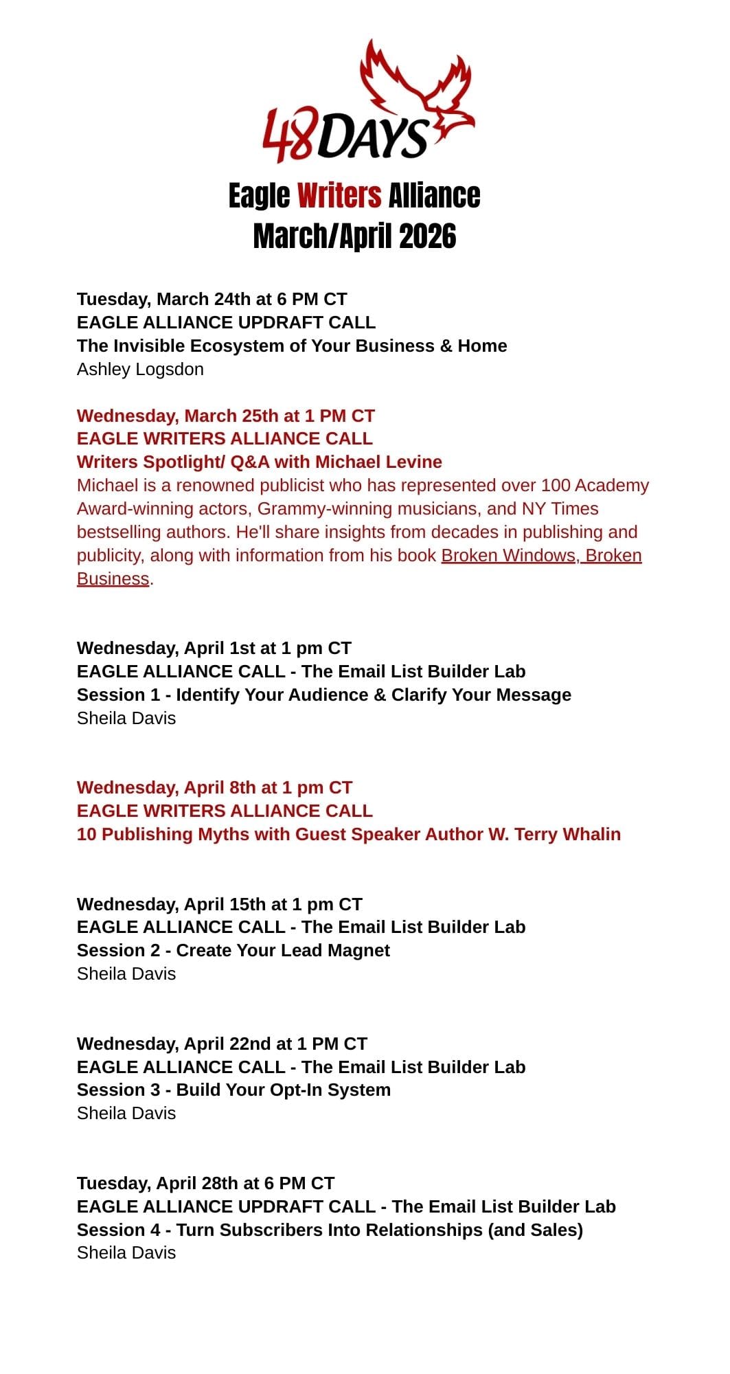 Members of the Eagle Writers Alliance may also submit their work to be considered for endorsement by 48 Days Press—offering a potential path for support with publishing, exposure through the wider 48 Days Community, features in emails, social media, and community calls.